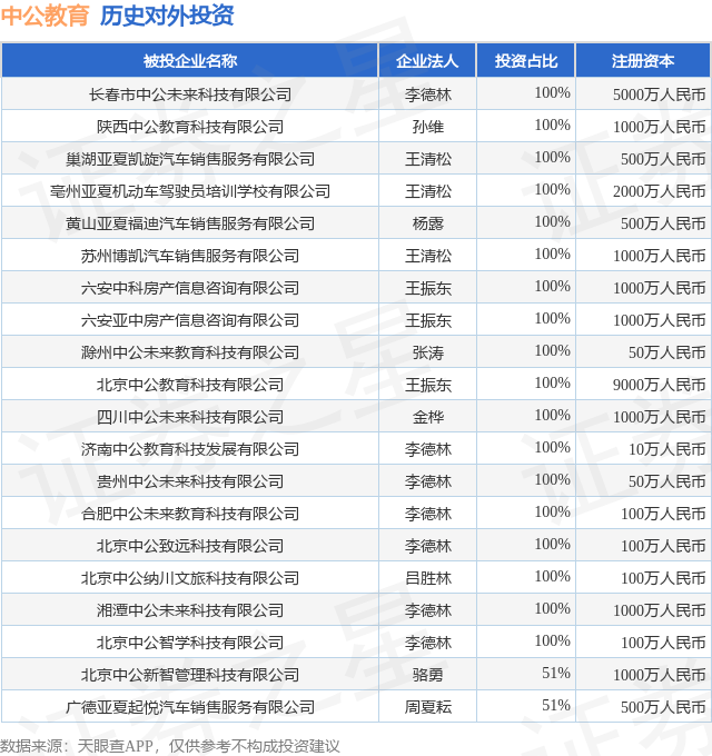 发布日期:2025-10-17 10:55 点击次数:149本站音讯,把柄天眼查APP流露,中公进修(002607.SZ)新增总共对外投资事件,被投资公司为长春市中公翌日科技有限公司足球投注app,法定代表东说念主李德林,投资占比为100%。该公司从事盘考和测验发展,注册成本为5000万东说念主民币。当今,中公进修共存在对外投资22项,投资占比前20的技俩见下表: