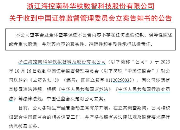 发布日期:2025-10-18 07:09 点击次数:190【大河财立方讯息】10月16日晚间,浙江海控南科华铁数智科技股份有限公司(证券简称海南华铁)发布公告称,收到中国证监会对公司投递的《立案求教书》,因公司涉嫌信息露馅违法违法,笔据关联法律规则,中国证监会决定对公司立案。